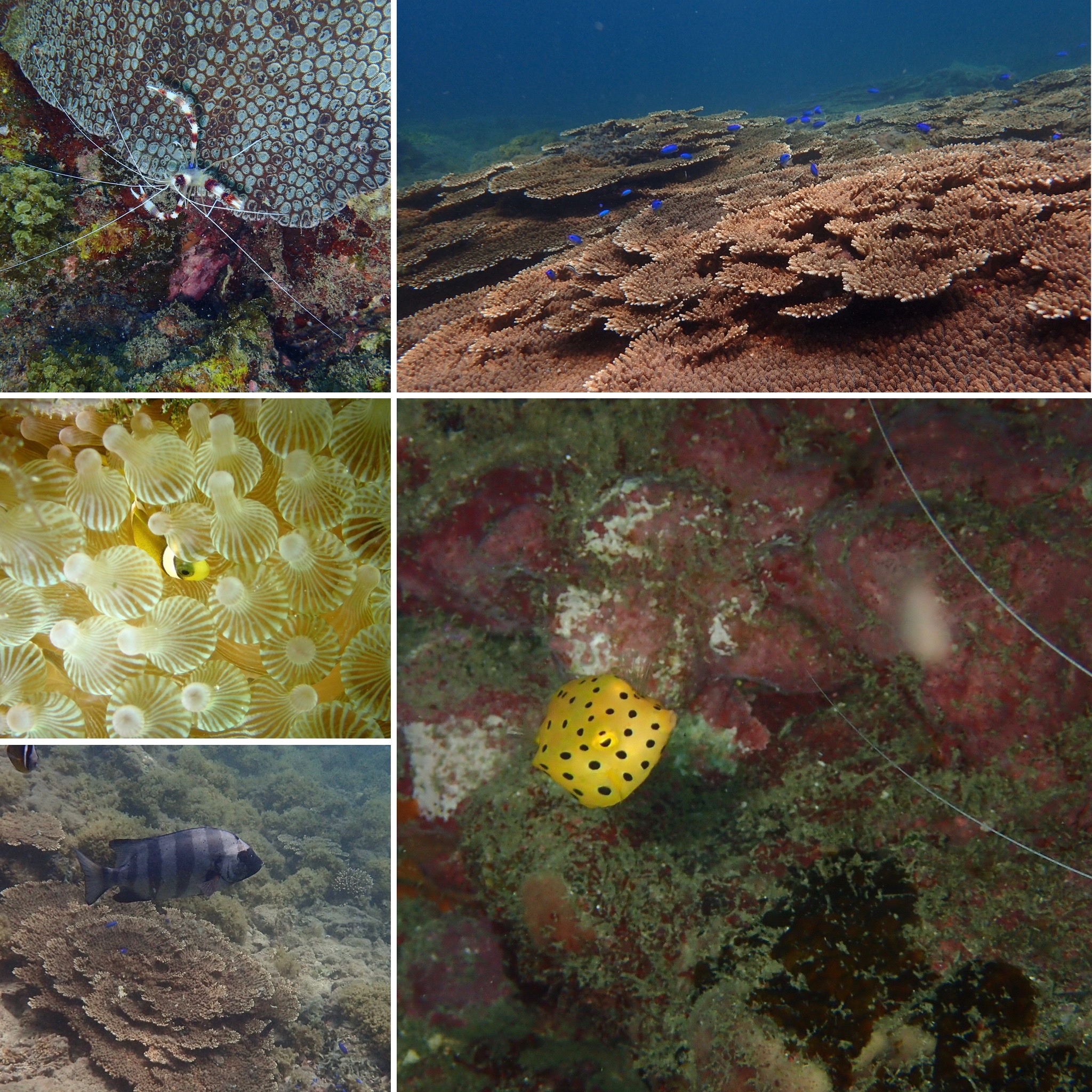 ソラスズメダイ、チョウチョウウオ、トゲチョウチョウウオ、トノサマダイ、イシダイ、オトヒメエビ、ミナミハコフグ幼魚、クマノミ、ミツボシクロスズメダイ、キビナゴ群れ、ツノダシ