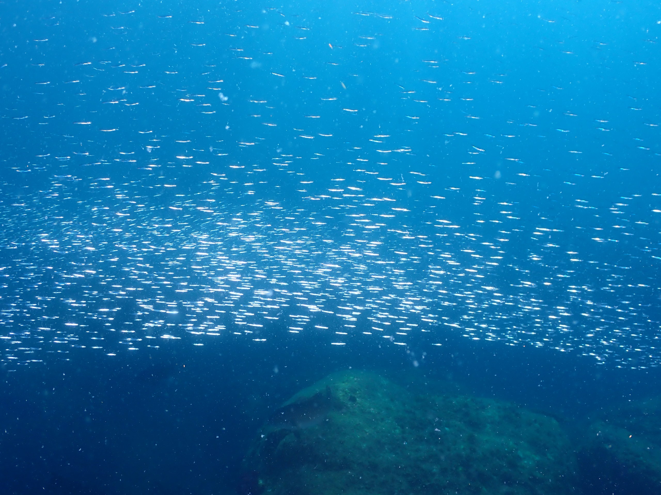 キビナゴ大群、タカサゴ群れ、チョウチョウウオ、シラコダイ、ソウシハギ、アカヒメジ、アオヤガラ、ヘラヤガラ、ハナミノカサゴ