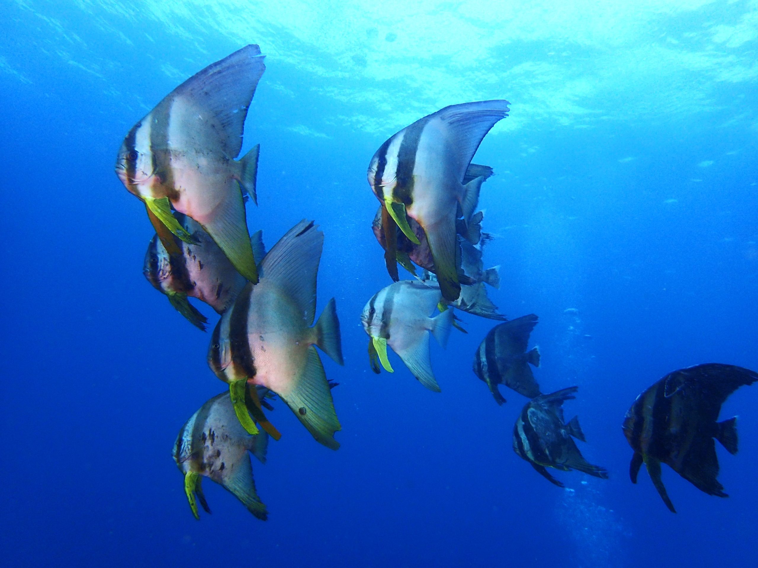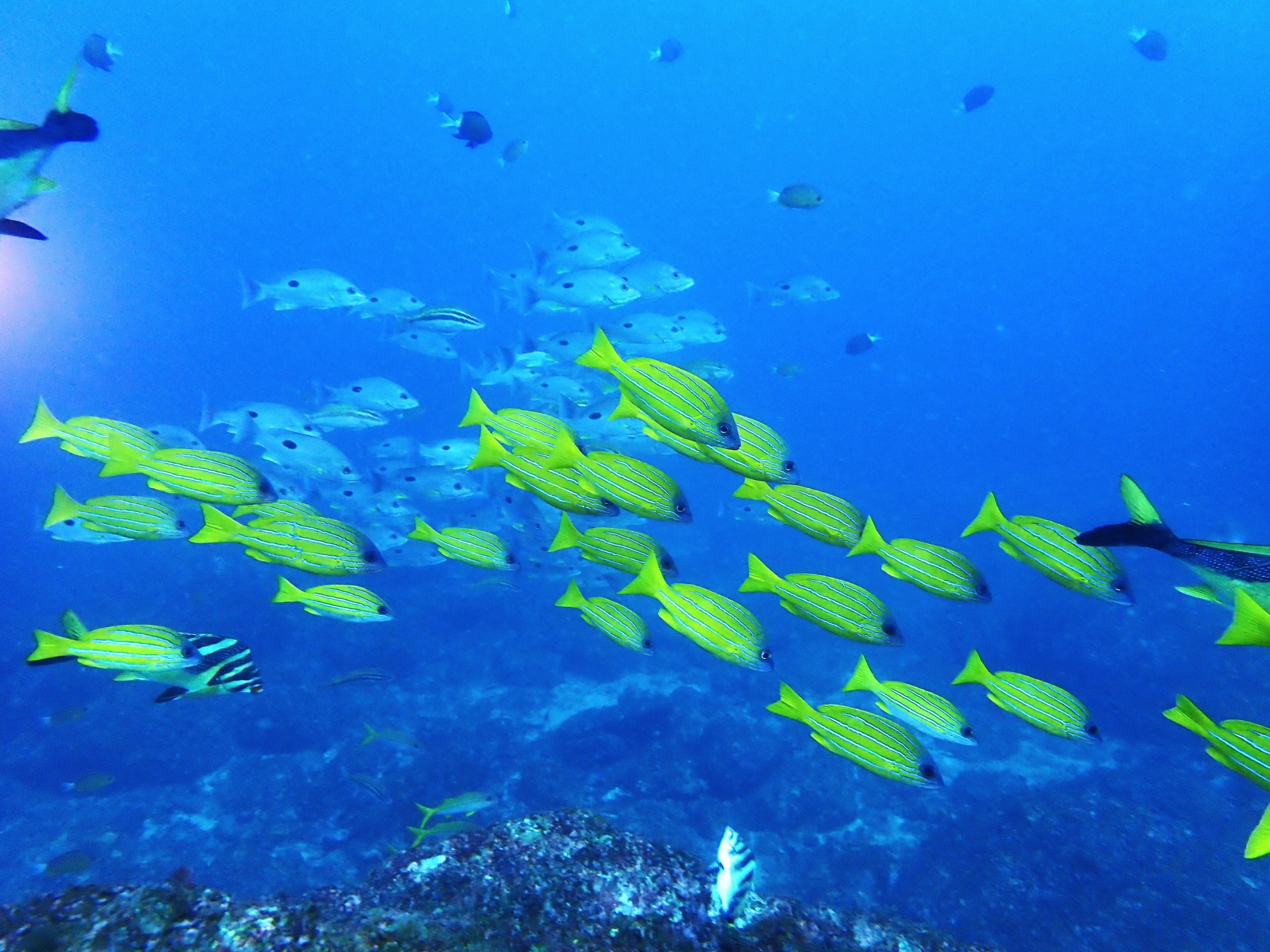 ツバメウオ群れ、テングダイ、アザハタ、トラウツボ、タテジマキンチャクダイ、ミドリリュウグウウミウシ、ニシキウミウシ、イサキ大群、ウメイロモドキ幼魚